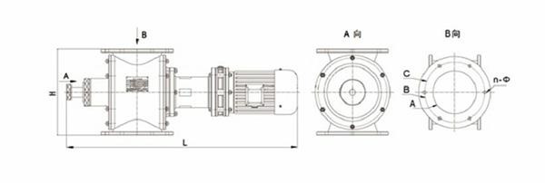 | 型號 | A | B | C | H | L | n-φ | 工作溫度 ℃ | 轉(zhuǎn)速r/min | 電機功率 kw |